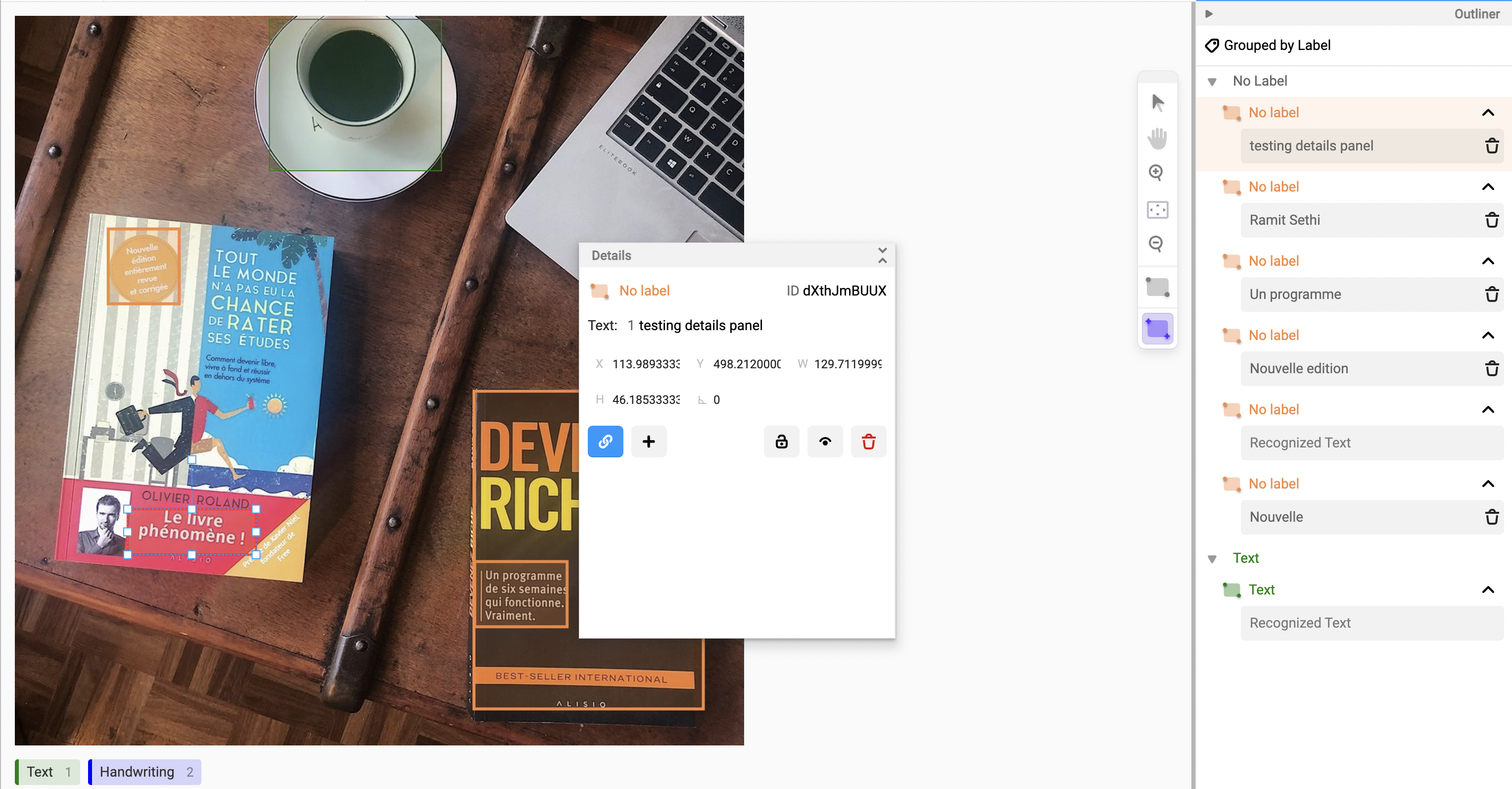 The Outliner is a replacement for the existing interface with a multiple-panel approach. This feature improves the user experience to fit more data in these two columns (Outliner and Details) and provides more options when working with regions. For example, Image segmentation is the only type of labeling that supports custom controls on the details panel.